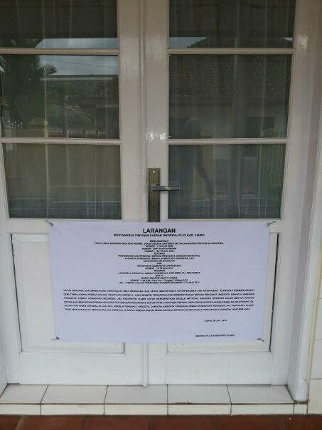 Segel berupa surat bernada arogan dari Bupati Ciamis. Ia terpampang di pintu masuk ruang shalat pada mesjid yang dikelola dan milik jamaah muslim Ahmadiyah (Jemaat Ahmadiyah Indonesia; JAI).